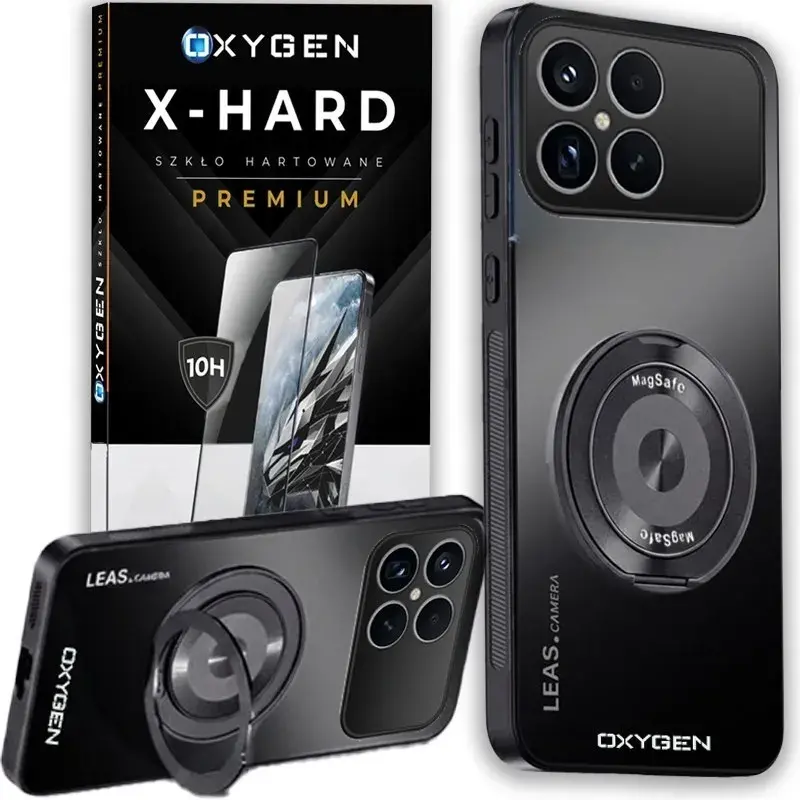 Etui na telefon Xiaomi Poco F8 PRO Czarne Oxygen LeaS MAGSafe + Szkło Hartowane X-HARD