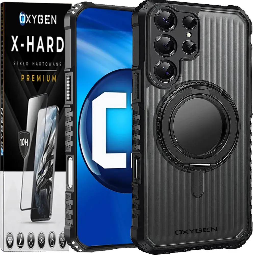 Pancerny zestaw ochronny do Samsung Galaxy S26 Ultra 6,9". Seria OXYGEN REX łączy wzmocnioną konstrukcję z metalowym ringiem oraz szkło hartowane 10H X-HARD zapewniające pełną ochronę ekranu.