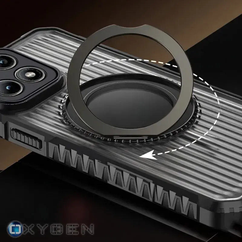 Metalowy ring holder zwiększa bezpieczeństwo chwytu, działa jako podstawka i współpracuje z uchwytami magnetycznymi oraz ładowaniem bezprzewodowym.