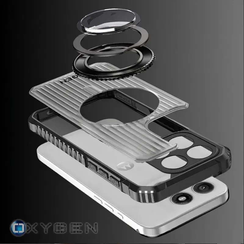 Metalowy ring holder zwiększa bezpieczeństwo chwytu, działa jako podstawka i współpracuje z uchwytami magnetycznymi oraz ładowaniem bezprzewodowym.