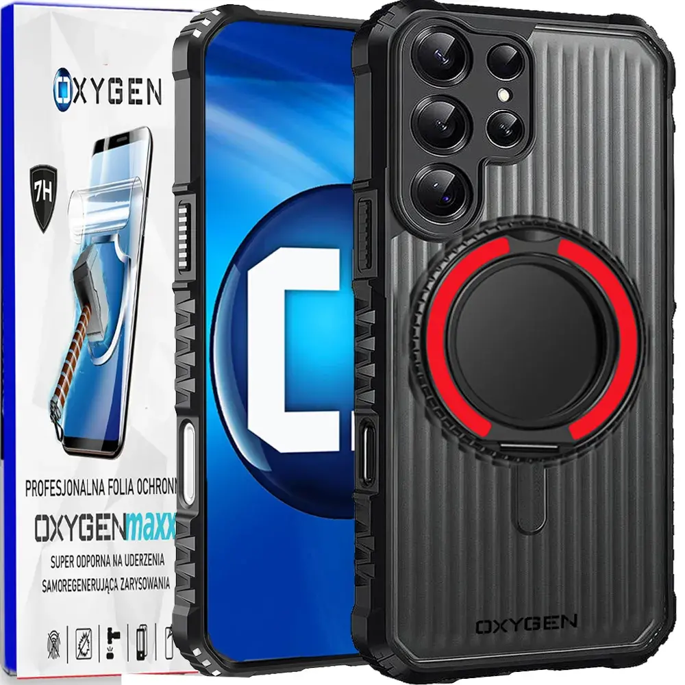 Pancerny zestaw ochronny do Samsung Galaxy S26 Ultra 6,9". Seria OXYGEN REX łączy wzmocnioną konstrukcję z metalowym ringiem oraz super folią samoregenerującą zapewniając pełną ochronę ekranu.