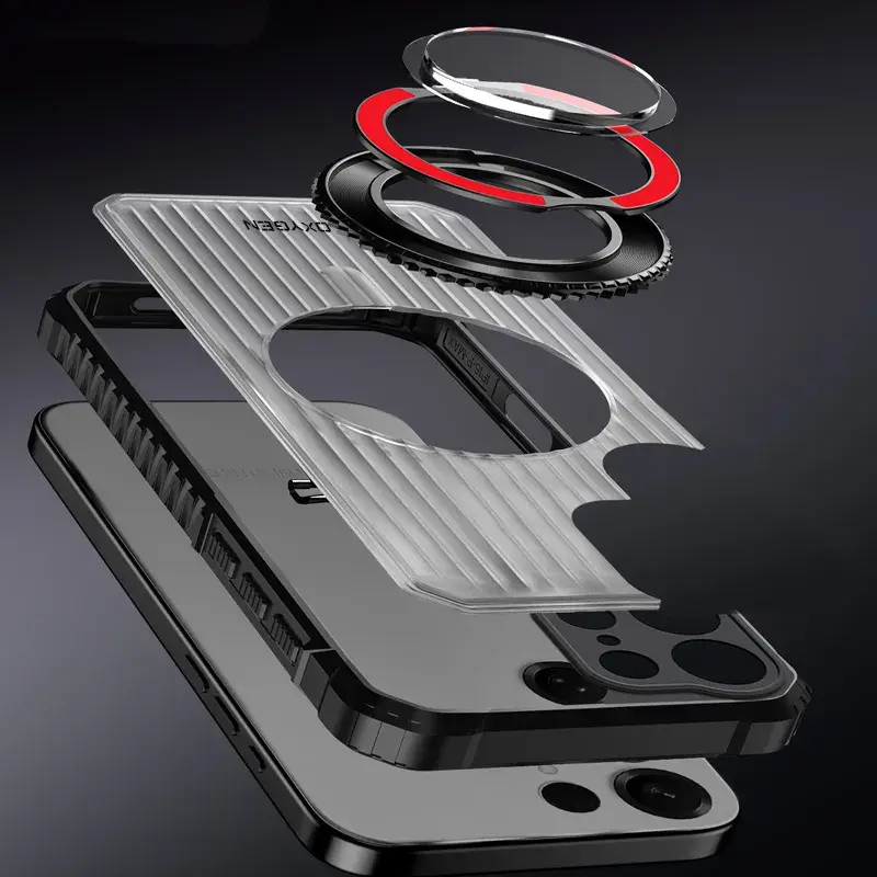 Metalowy ring holder zwiększa bezpieczeństwo chwytu, działa jako podstawka i współpracuje z uchwytami magnetycznymi oraz ładowaniem bezprzewodowym.