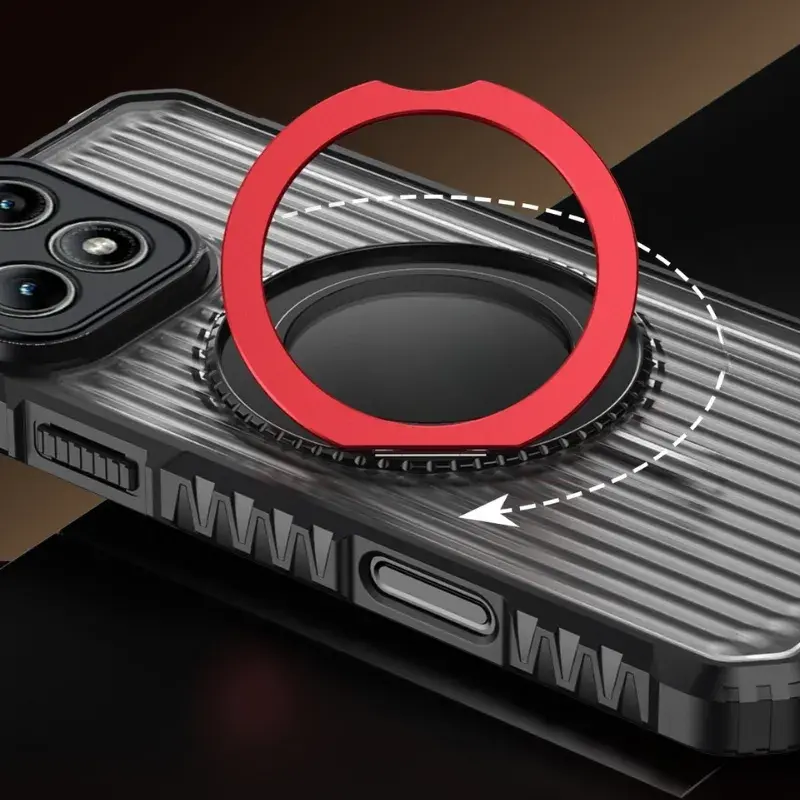 Metalowy ring holder zwiększa bezpieczeństwo chwytu, działa jako podstawka i współpracuje z uchwytami magnetycznymi oraz ładowaniem bezprzewodowym.