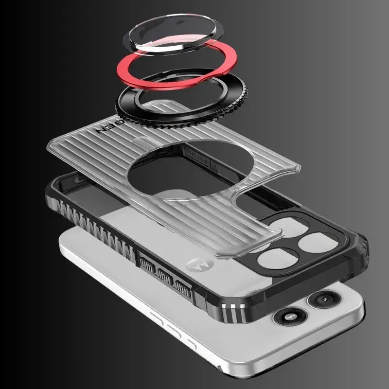 Metalowy ring holder zwiększa bezpieczeństwo chwytu, działa jako podstawka i współpracuje z uchwytami magnetycznymi oraz ładowaniem bezprzewodowym.