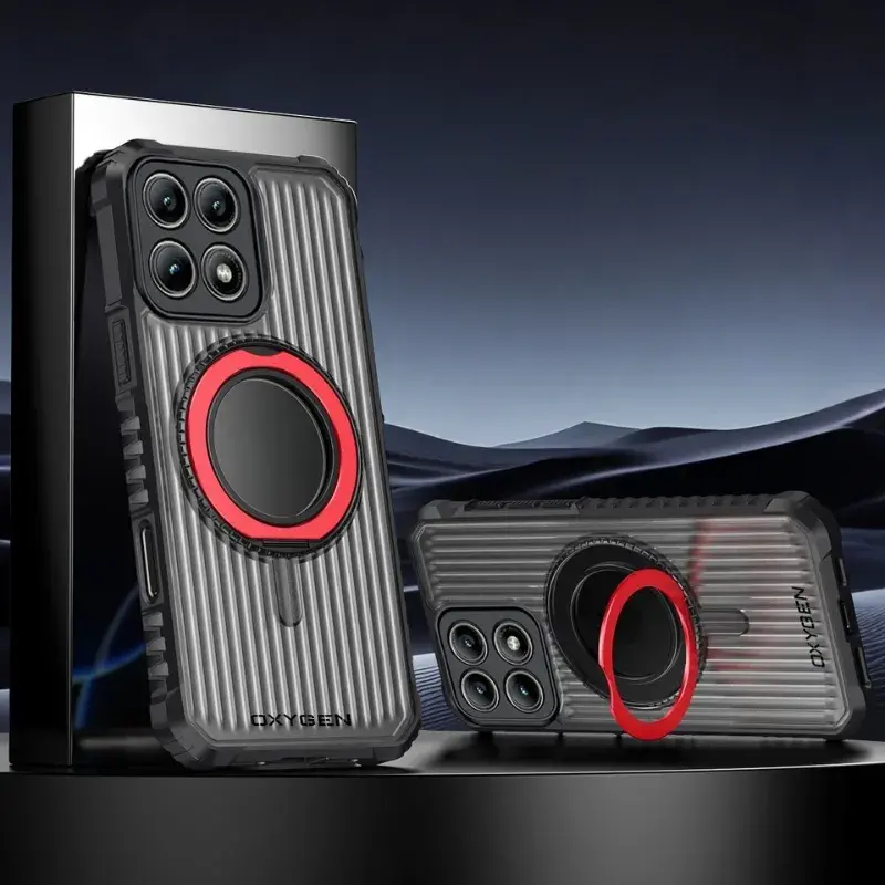 Metalowy ring holder zwiększa bezpieczeństwo chwytu, działa jako podstawka i współpracuje z uchwytami magnetycznymi oraz ładowaniem bezprzewodowym.